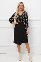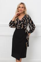 Элегантное платье приталенного силуэта, выполненное из плательно - костюмной и легкой ткани Ниагара. V - образная горловина на внутренней обтачке плавно переходит в запах. Длинные втачные рукава присборены на резинку. Юбка выполнена с запахом по переду. Линия талии дополнена втачным поясом, который можно завязать в элегантный бант.