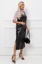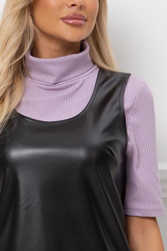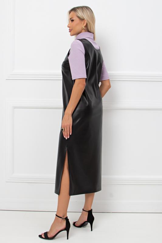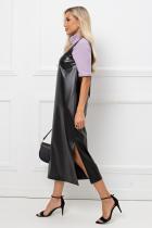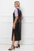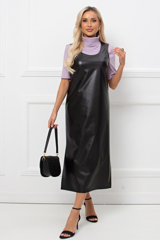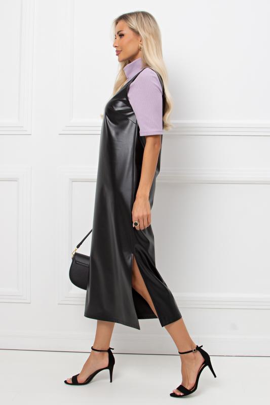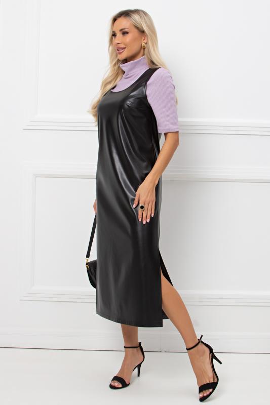 Стильный сарафан прямого кроя из экокожи. Горловина и пройма на внутренней обтачке. Низ ровный, по бокам разрезы. Модель без подкладки.