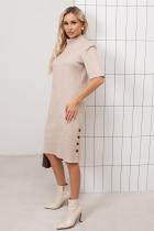 Стильное платье прямого кроя из трикотажного полотна. Горловина оформлена воротником - стойка с застежкой на потайную молнию. Втачной короткий рукав. Низ ровный, левый бок оформлен декоративной планкой.