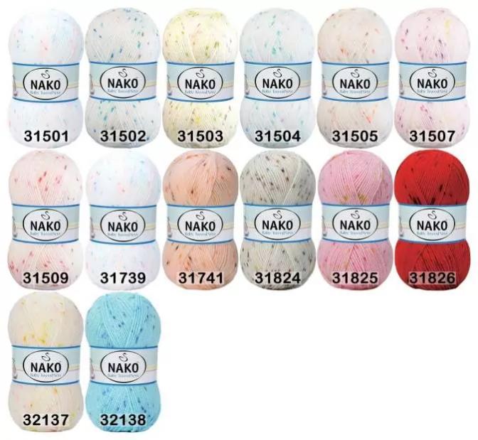 Нако беби твид нью. Пряжа из 100% акрила для детских изделий и для тех, кто чувствителен к шерсти. Мягкая пряжа с цветными вкраплениями. Толщина нити средняя, что позволит быстро связать новую вещь.Инструменты: спицы 3,5 –4, крючок 4.Плотность вязания: 10х10см = 29р.х25п.Рекомендации по уходу: деликатная ручная стирка при 30°С, не отжимать в стиральной машине, не отбеливать хлорсодержащими веществами. Сушить на горизонтальной поверхности, предварительно придав изделию естественную форму. Гладить – утюгом, разогретым до минимальной рабочей мощности.