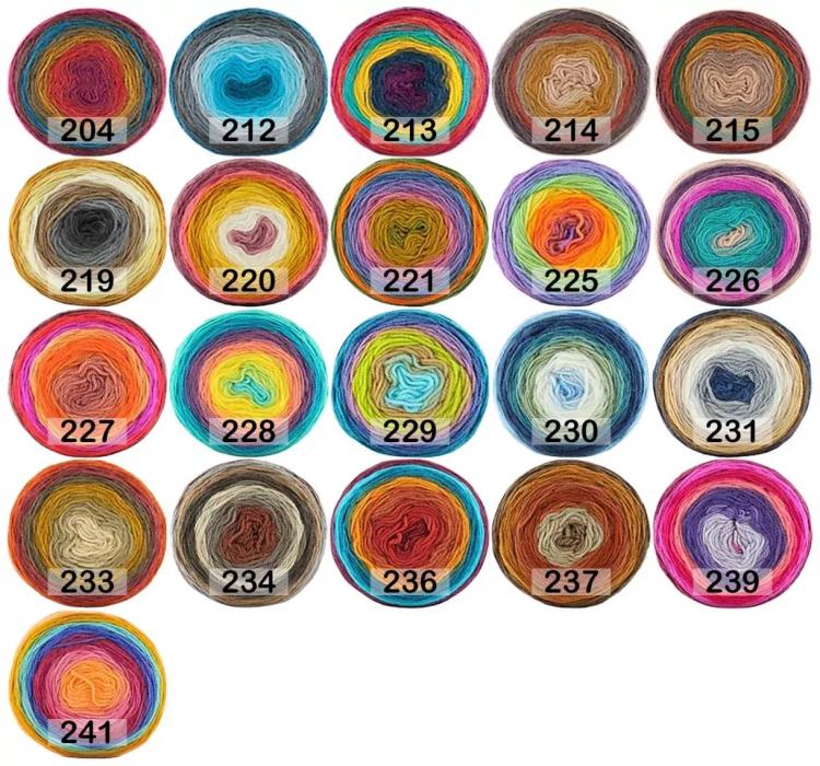 Кейк папатия невероятно красочная пряжа, имеет совершенно волшебный цветовой градиент. Благодаря длине мотка, Papatya Cake идеально подходит для изготовления шали. Многие узоры подходят для работы с этой пряжей. Принт разноцвеный и очень длинный. Рекомендуемые спицы 4-4.5, крючок 3 мм. В полотне 10x10cm = 18 рядов x 27 петель