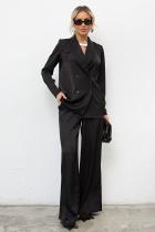 Классический двубортный жакет с шалевым воротником выполнен из атласной ткани.