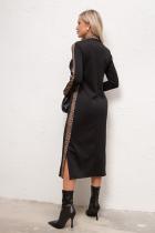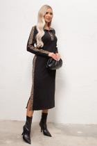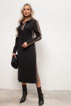 Стильное платье полуприлегающего силуэта выполнено из плотного трикотажного полотна. Горловина оформлена отложным воротником переходящим в планку с застежкой на петли и пуговицы. Длинный втачной рукав. Модель оформлена втачными лампасами с леопардовым принтом. Низ ровный, по бокам шлицы.