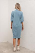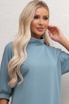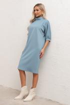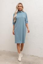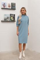 Элегантное платье свободного кроя выполнено из однотонного трикотажного полотна. Короткий рукав - летучая мышь присобрана на манжету. Горловина оформлена воротником - стойка. По среднему шву спинки застежка на потайную ленту - молнию. Низ ровный, без разрезов.