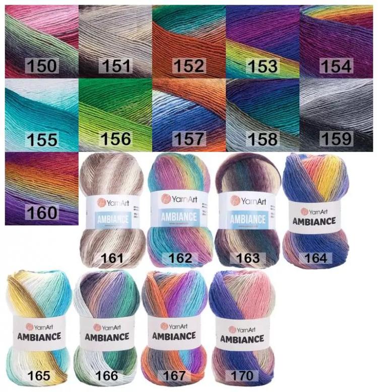 Пряжа ЯрнАрт Амбиэнс. Ощутите мягкость и комфорт изделий, связанных из полушерстяной пряжи с гармоничными переходами цветов! Она сама создает уникальные цветовые полосы благодаря секционному крашению, что придаст вашей одежде элегантный вид. Создание изделий из этой нити - настоящее удовольствие! Слабо выраженная крутка обеспечивает безупречную мягкость, а акриловые волокна в составе делают изделия стойкими к износу. Подходит для осенне-зимнего сезона. Рекомендуемые размеры спиц-крючка №4. Создавайте неповторимые вещи с этой уникальной пряжей, которые будут радовать вас и ваших близких многие года!