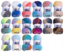 ЯрнАрт Беллисимо. Мохер фантазийной окраски. Нить пушистая и легкая. В полотно она ложится немного небрежно за счет неравномерного ворса. Изделие нужно вязать с первого раза, т.к. распустить его будет не возможно. На вязаном образце 10х10см получается 18 рядов по 22 петли. Для пуловера размера S потребуется 400 гр., М: 500 гр., L: 600 гр. пряжи. Производители рекомендуют спицы №5 и крючок №5.5.