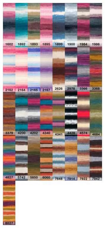 Ализе буркум батик. Классическая демисезонная пряжа длинно-секционного крашения. Мягкая, «нескрипучая», плотно скрученная эластичная нить , не деформируется после распускания. Петли ложатся ровно, полотно не «косит», нитка не перекручивается. Вещи приятны к коже, не колются, не линяют, не теряют своей формы, не образуют катышков. Эта пряжа за счет красивых цветовых переходов поможет создать неповторимые модели свитеров, жилетов, кардиганов, шарфов, шапок, аксессуаров, пледов и других изделий. Инструменты: спицы 4 – 6, крючок 2 - 4. Плотность вязания: 10 см. х 10 см. = 15 петель х 20 рядов. Готовое изделие надолго сохранит первоначальный внешний вид, устойчиво к моли, не выгорает на солнце, не растягивается, не дает усадку после стирки. Рекомендации по уходу: деликатная стирка при 30°С, не отжимать в стиральной машине, не отбеливать хлоросодержащими веществами. Глажение на минимальной температуре. Сушите на горизонтальной поверхности: предварительно придав изделию естественную форму.