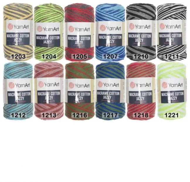 ЯрнАрт макраме коттон джази. Рекомендуемый размер спиц и крючка №5. Плотность вязания 10х10 см: спицами 18п х 24р, крючком 13п х 20р.