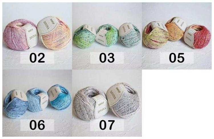 Пряжа Дивина покоряет своей нежностью и необыкновенной брызганой окраской. Благодаря мягкости нити из неё можно вязать одежду для взрослых и детей. Рекомендуемые спицы и крючок: 2,5- 3,5 мм.