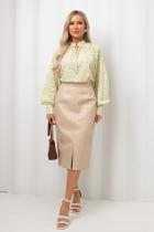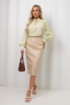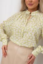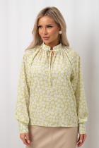 Женственная блузка свободного силуэта из легкой ткани креп-шифон. Длинный рукав - реглан оканчивается притачной манжетой на сборке. Горловина оформлена воротником - стойка, переходящей в разрез - капля, с завязкой. Низ ровный, без разрезов.