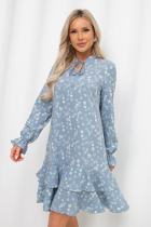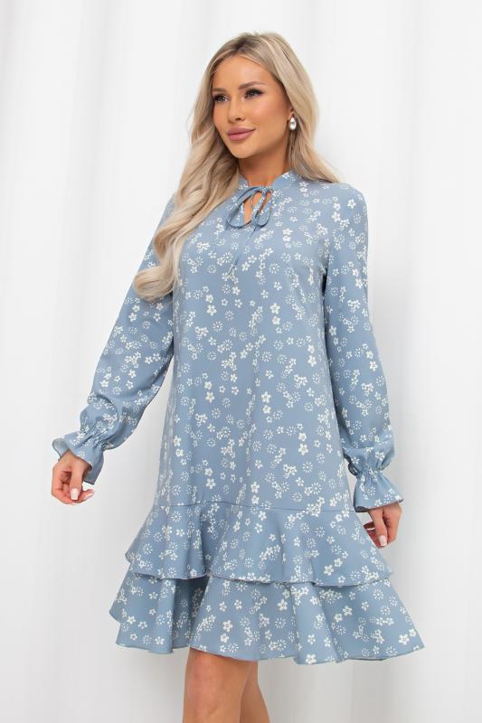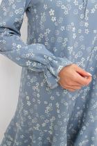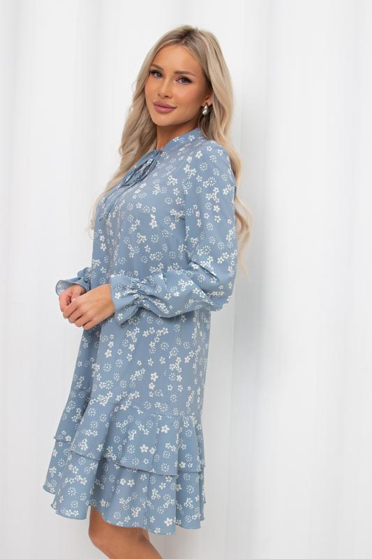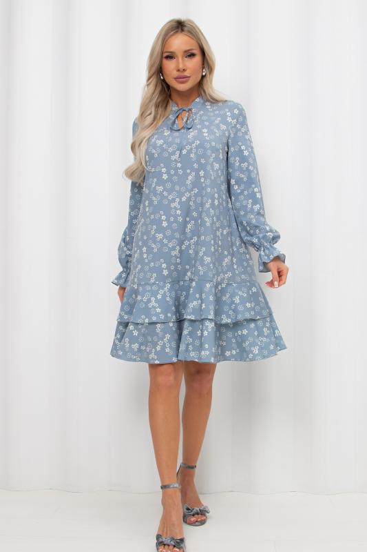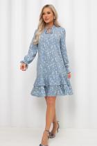 Романтичное платье А силуэта выполнено из легкой ткани Ниагара. V - образная горловина оформлена стойкой с завязками. Длинный втачной рукав присборен на эластичную резинку. Низ платья оформлен притачным воланом.
