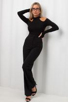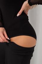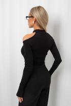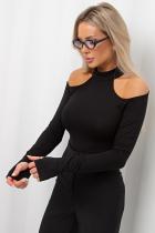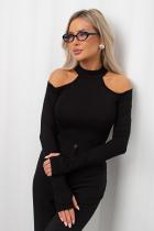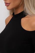 Эластичный боди из однотонного трикотажного полотна с длинными рукавами через палец и открытыми плечами. Горловина оформлена стойкой. В зоне ластовицы застежка на крючки.