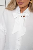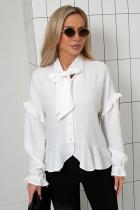Стильная блузка свободного кроя.Горловина оформлена воротником-стойкой, переходящим в пышный бант на завязках. Длинный втачной рукав со спущенным плечом по окату оформлен рюшей, низ рукава присборен на кулиску. По переду планка с застежкой на петли и пуговицы. Низ ассиметричный, оформлен баской.