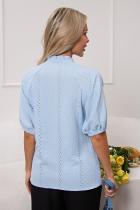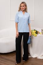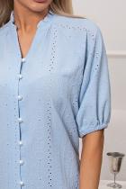 . Короткий рукав - реглан присборен по низу на эластичную резинку. V-образная горловина оформлена стойкой-рюшей, по переду застежка на петли и пуговицы. Низ ровный, без разрезов.