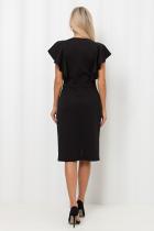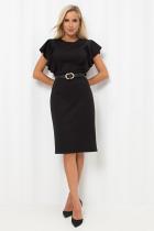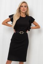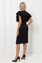 Женственное платье прилегающего силуэта выполнено из трикотажного полотна. Округлая горловина на внутренней обтачке. Модель отрезная по линии талии. Верх оформлен втачными воланами. По спинке застежка на потайную молнию. Низ ровный, сзади разрез.