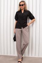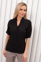 . Короткий рукав - реглан присборен по низу на эластичную резинку. V-образная горловина оформлена стойкой-рюшей, по переду застежка на петли и пуговицы. Низ ровный, без разрезов.