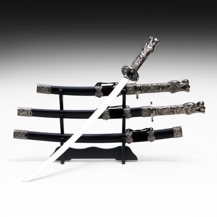 Макет оружия «Сувенирные катаны на подставке 3в1. Голова дракона», подарочный набор, ножны кожзам, чёрный, 45 см; 52 см; 61 см