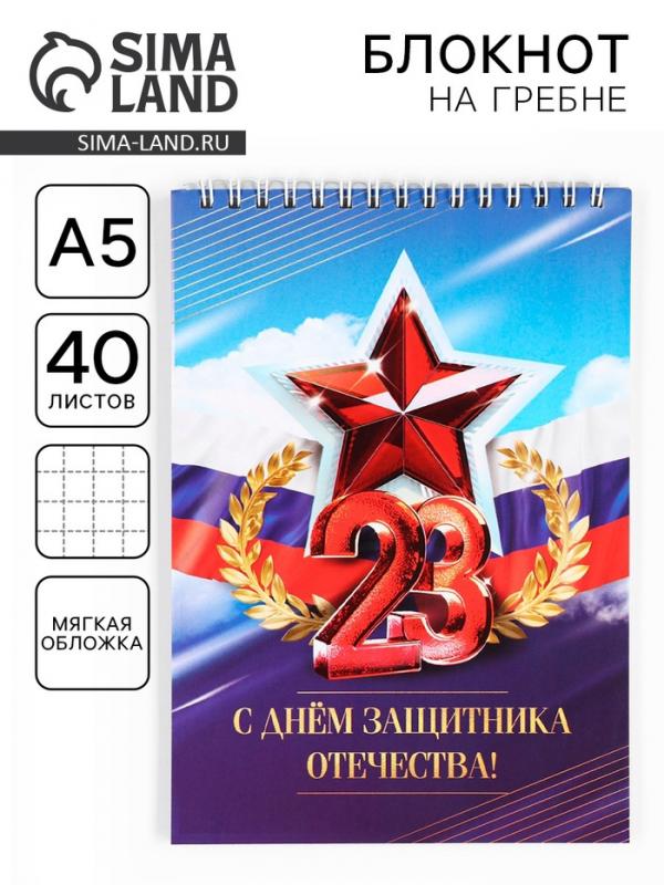 Блокнот А5, 40 л. на гребне в клетку «23 Февраля»