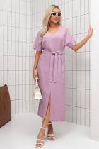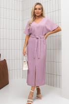 Летнее платье прямого силуэта выполнено из однотонного полотна. V-образная горловина на внутренней обтачке. Цельнокроеный короткий рукав. Низ изделия ровный, по переду разрез.Пояс из основной ткани входит в комплект.