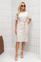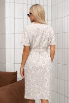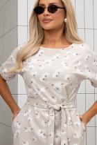 Легкое платье прямого силуэта. Округлая горловина на внутренней обтачке. Короткие цельнокроеные рукава, оканчиваются манжетами на отворотах. В среднем шве спинки расположен разрез с застежкой на пуговицу. Пояс из основного материала в комплекте. Низ ровный, без разрезов.