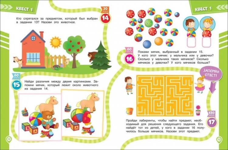 Книга состоит из 8 квестов. Каждый квест законченная история со своими героями, которым нужно помочь что-то найти, куда-то добраться и т. д. В начале квеста ставится игровая задача, в конце подводится итог. Задания в книге идут цепочкой, переходя одно в другое. Каждое предыдущее задание служит ключом к последующему. Новое задание выполнить не получится, если предыдущее сделано неправильно. Содержательно задания охватывают всю тематику дошкольной подготовки (математика, грамота, окружающий мир, логика и т.д .).