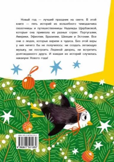 Новый год - лучший праздник на свете. В этой книге - пять историй из волшебного чемоданчика сказочницы и путешественницы Надежды Щербаковой, которые она привезла из разных стран: Португалии, Америки, Эфиопии, Бразилии, Швеции и Эстонии. Все они о людях, которые верили в чудеса. Без этой веры у них ничего бы не получилось: ни создать летающую музыку, ни построить Ледяной дворец, ни встретить долгожданного друга. И каждая из историй случилась накануне Нового года!
