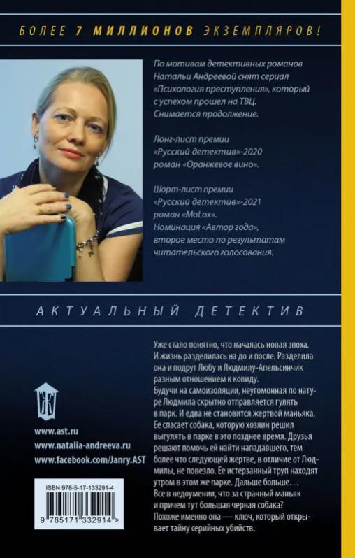Уже стало понятно, что началась новая эпоха. И жизнь разделилась на до и после. Бывшие подруги, Люба и Людмила по прозвищу Апельсинчик по-разному относятся к ковиду. Пока он не вторгается в семью Людмилы: заболел ее муж. Будучи на самоизоляции, анархистка по натуре Людмила, идет поздно вечером в парк, прогуляться. И едва не становится жертвой маньяка. Ее спасает собака, которую хозяин решил выгулять в парке в это позднее время. В полицию Апельсинчик пойти не может: ей грозит штраф, а то и статья УК за нарушение карантина. Приходится ее друзьям подключиться к расследованию, тем более что следующей жертве, Анжелике Масловой в отличие от Людмилы не повезло. Ее истерзанный труп находят утром в этом же парке. Но с каждым новым днем в деле о маньяке появляется все больше странностей. А женщины ли его интересуют? И причем тут большая черная собака? А она, похоже, ключ, который открывает тайну серийных убийств._x000D_ По мотивам детективных романов Натальи Андреевой снят сериал "