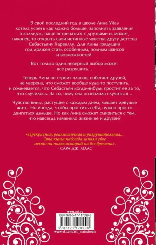 В свой последний год в школе Лина Уйаз хотела успеть как можно больше: заполнить заявления в колледж, чаще встречаться с друзьями и, может, наконец-то открыть свои истинные чувства другу детства Себастьяну Харвеллу. Для Лины грядущий год должен стать особенным, полным шансов и возможностей._x000D_.Вот только один неверный выбор может все разрушить…_x000D_.Теперь Лина не строит планов, избегает друзей, не уверена, что сможет вообще куда-то поступить, и сомневается, что Себастьян когда-нибудь простит ее за то, что случилось. За то, чему она позволила случиться…_x000D_.Чувство вины, растущее с каждым днем, мешает девушке жить. Но иногда, чтобы простить себя, нужно просто двигаться дальше. Но как Лина сможет смириться с тем, что навсегда изменило жизни ее и друзей?_x000D_._x000D_.