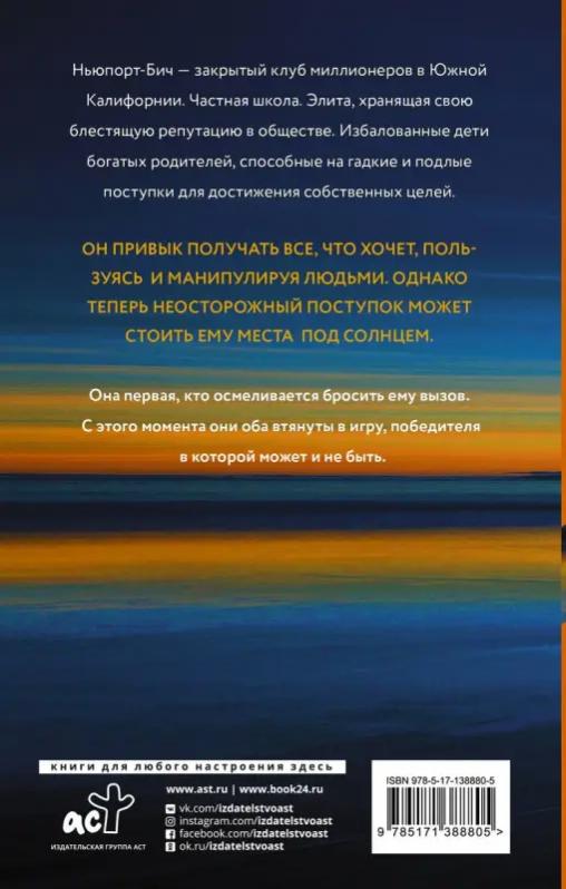 Ньюпорт-Бич — закрытый клуб миллионеров в Южной Калифорнии. Частная школа. Элита, хранящая свою блестящую репутацию в обществе. Избалованные дети богатых родителей, способные на гадкие и подлые поступки для достижения собственных целей._x000D_ Он привык получать все, что хочет, пользуясь и манипулируя людьми. Однако теперь неосторожный поступок может стоить ему места под солнцем._x000D_ Она — первая, кто осмеливается бросить ему вызов._x000D_ С этого момента они оба втянуты в игру, победителя в которой может и не быть.