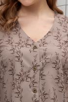 Легкий костюм свободного кроя. Рубашка прямого кроя с коротким втачным рукавом. V - образная горловина, переходящая в планку с застежкой на петли и пуговицы. Низ прямой, по бокам разрезы. Брюки с комфортной посадкой на талии, которую обеспечивает притачной пояс на резинке.