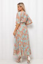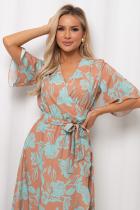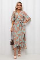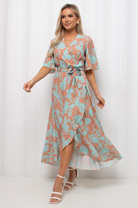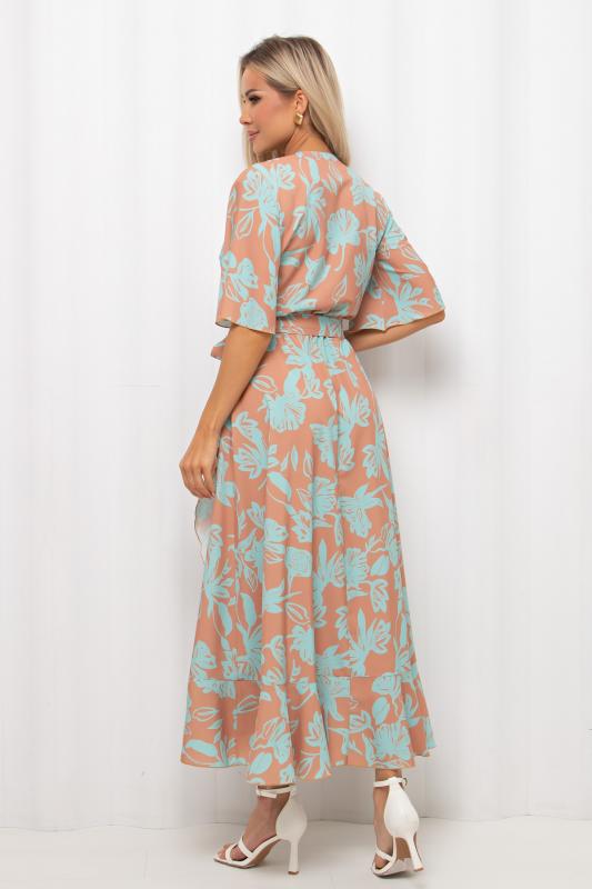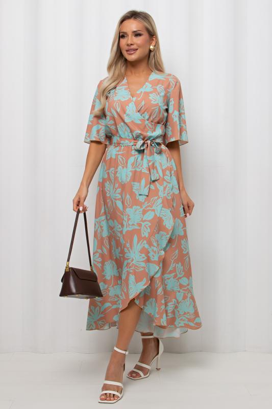 Легкое летнее платье приталенного силуэта. V - образная горловина на внутренней обтачке переходящая в запах. Короткий втачной рукав. Модель отрезная по линии талии, присборена на резинку. Перед юбки на запахе. Низ оформлен притачным воланом. Пояс из основной ткани в комплекте.