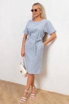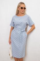 Легкое платье прямого силуэта. Округлая горловина на внутренней обтачке. Короткие цельнокроеные рукава, оканчиваются манжетами на отворотах. В среднем шве спинки расположен разрез с застежкой на пуговицу. Пояс из основного материала в комплекте. Низ ровный, без разрезов.