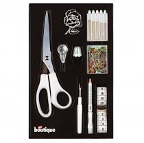 В комплекте: -ножницы (цв.белый, длина 20,5см), -сантиметр, -наперсток, -распарыватель, -меловой карандаш, -иглы для шитья разного размера (25 шт), -булавки с разноцветными стеклянными головками. Упаковка: пластиковая коробка 26,5 х 16,5 х 2 см.