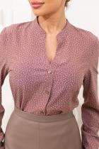 . Рукава втачные, книзу с защипами, заканчиваются манжетами на пуговицах. Горловина дополнена воротником-стойкой, переходящим в V-образный вырез. Низ прямой, без разрезов. Модель придаст Вашему деловому образу очарования и шарма.