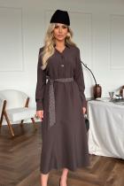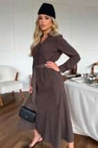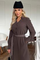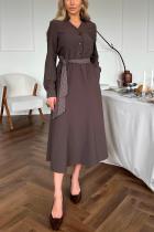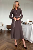 Повседневное платье приталенного силуэта из плательно-костюмной ткани.V-образная горловина оформлена отложным воротником на стойке. По переду планка с застежкой на петли и пуговицы. Длинный втачной рукав оформлен притачной манжетой. Юбка состоит из шести клиньев. В боковых швах функциональные карманы. Модель отрезная по линии талии присборена на резинку. Платье дополняет пояс с отделкой.