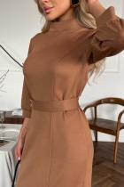 Платье полуприлегающего силуэта изготовлено из трикотажного полотна. Горловина оформлена воротником-стойка, по среднему шву спинки застежка на потайную молнию. Втачной рукав длиной 7-8 присобран на монжету. Модель отрезная по линии талии дополнена поясом с застежкой на петли и пуговицы. Низ ровный, по переду шлица.
