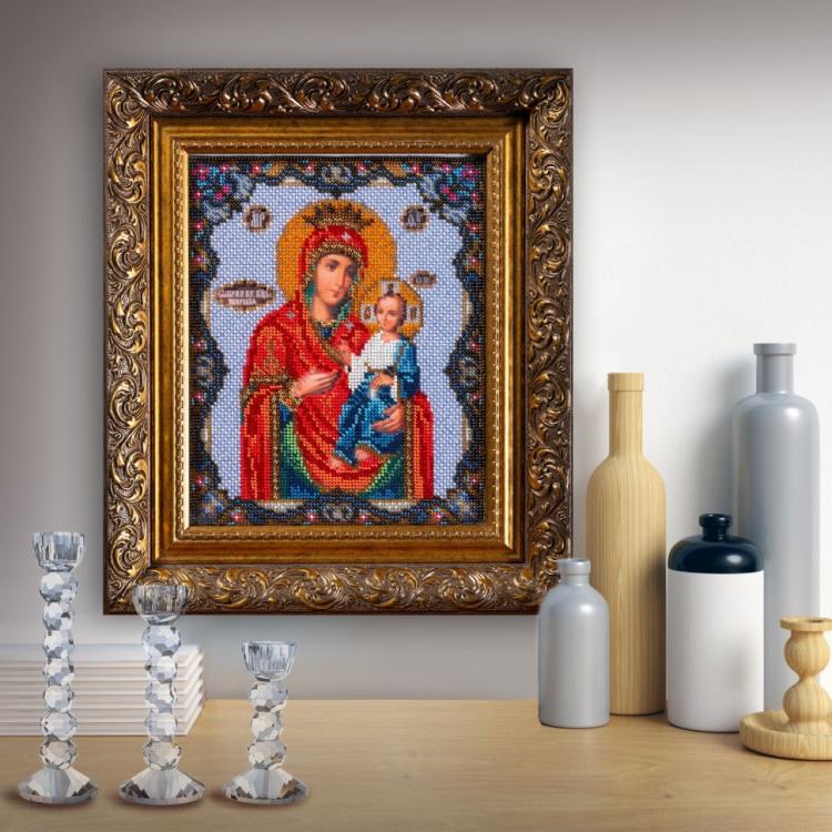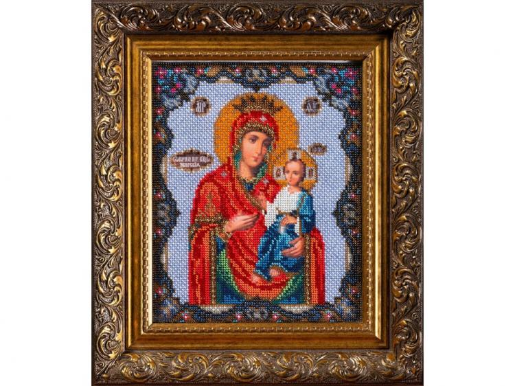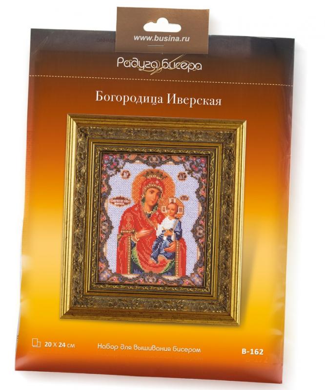 20*24 см, в состав набора входит: канва (лён с нанесенным рисунком) для бисерной вышивки, чешский бисер, игла для бисера, схема и описание к работе, рамка в набор не входит.Почитаемая в России Иверская икона является списком с древнего образа, который хранится в Греции на горе Афон, в Иверском монастыре. История афонской иконы ведет свое начало с 9 века. Византийский император Феофил послал своих воинов истреблять святые иконы. В одном из домов, где хранилась икона, воин ударил мечом в ланиту Богородицы. К его ужасу, из раны потекла кровь. Пораженный чудом, воин с раскаянием пал на колени. Верующие прибегают к помощи этой иконы во время болезни и напасти.