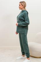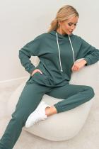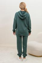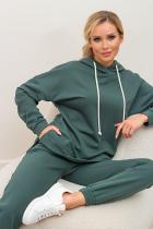 . Состоит из толстовки и брюк. Толстовка свободного кроя со спущенным плечом. Длинный рукав со спущенным плечом, оканчивается притачной манжетой. Модель с капюшоном. Низ ассиметричный, оформление манжетой, по бокам разрезы. Брюки с комфортной посадкой на талии, которую обеспечивает пояс на резинке. Брючины оканчиваются широкими манжетами на резинке. Модель имеет функциональные карманы в боковых швах. Идеальный вариант для спорта и отдыха.