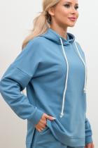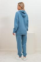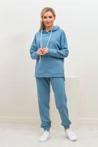 Стильный костюм из трикотажного полотна - футер. Состоит из толстовки и брюк. Толстовка свободного кроя со спущенным плечом. Длинный рукав со спущенным плечом, оканчивается притачной манжетой. Модель с капюшоном. Низ ассиметричный, оформление манжетой, по бокам разрезы. Брюки с комфортной посадкой на талии, которую обеспечивает пояс на резинке. Брючины оканчиваются широкими манжетами на резинке. Модель имеет функциональные карманы в боковых швах. Идеальный вариант для спорта и отдыха.