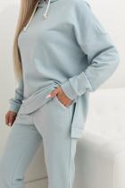 Стильный костюм из трикотажного полотна - футер. Состоит из толстовки и брюк. Толстовка свободного кроя со спущенным плечом. Длинный рукав со спущенным плечом, оканчивается притачной манжетой. Модель с капюшоном. Низ ассиметричный, оформление манжетой, по бокам разрезы. Брюки с комфортной посадкой на талии, которую обеспечивает пояс на резинке. Брючины оканчиваются широкими манжетами на резинке. Модель имеет функциональные карманы в боковых швах. Идеальный вариант для спорта и отдыха.