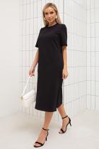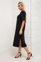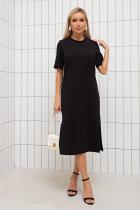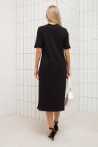 Стильное платье прямого силуэта выполнено из трикотажного полотна Футер 2х нитка. Короткий втачной рукав по низу оформлен двойным отворотом. Округлая горловина с необработанным срезом. Низ ровный, по бокам разрезы.