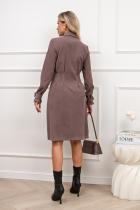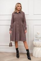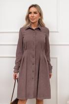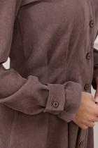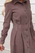 Платье-рубашка приталенного силуэта изготовлено из ткани «вельвет». Горловина оформлена отложным воротником на стойке. По переду выполнена планка с застежкой на петли и пуговицы. Длинный втачной рукав по запястью оформлен патой. По линии талии застрочены складки. Низ ровный, без разрезов.