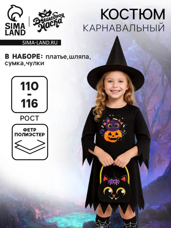 Карнавальный костюм «Зловещая Колдунья»: платье, шляпа, сумка, чулки, рост 110-116 см
