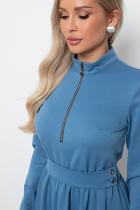 Элегантное платье приталенного силуэта из трикотажного полотна. Горловина оформлена воротником- стойкой с застежкой на молнию. Длинный втачной рукав. Модель отрезная по линии талии, присборена на эластичную резинку. В боковых швах функциональные карманы. Пояс с застежкой на петли и пуговицы. Низ ровный, без разрезов.