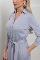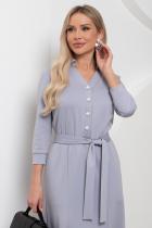 Комфортное платье прилегающего силуэта из трикотажного полотна.V-образная горловина оформлена отложным воротником на стойке. По переду планка с застежкой на петли и пуговицы. Втачной рукав длиной ¾ оформлен притачной манжетой. Юбка состоит из шести клиньев. Модель отрезная по линии талии, присборена на резинку. Пояс из основной ткани в комплекте.