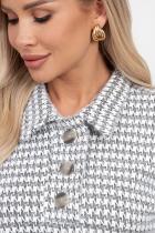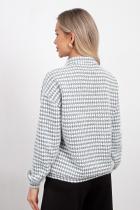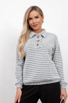 Комфортный джемпер свободного кроя из трикотажного полотна. Длинный втачной рукав со спущенным плечом присобран на манжету. Отложной воротник. Перед оформлен планкой с застежкой на петли и пуговицы. Низ на манжете.