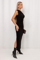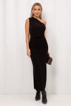Вечернее платье облегающего силуэта выполнено из легкого трикотажного полотна. Платье на одно плечо, с драпировкой. С боку по ноге разрез.