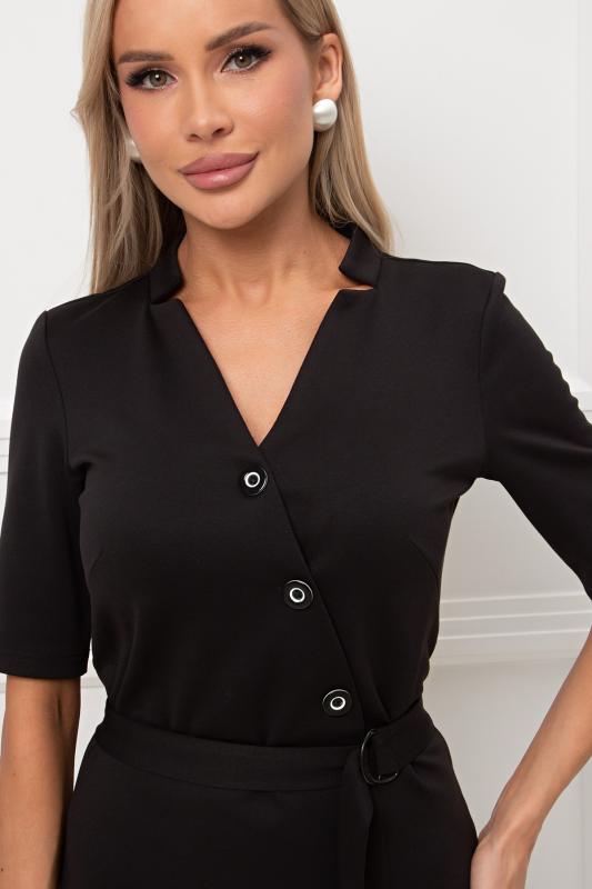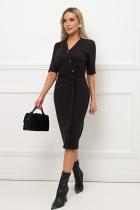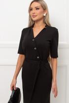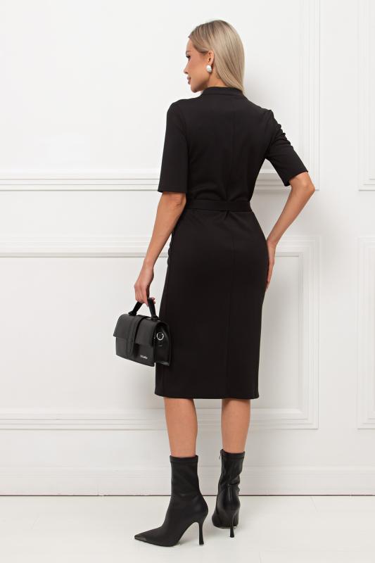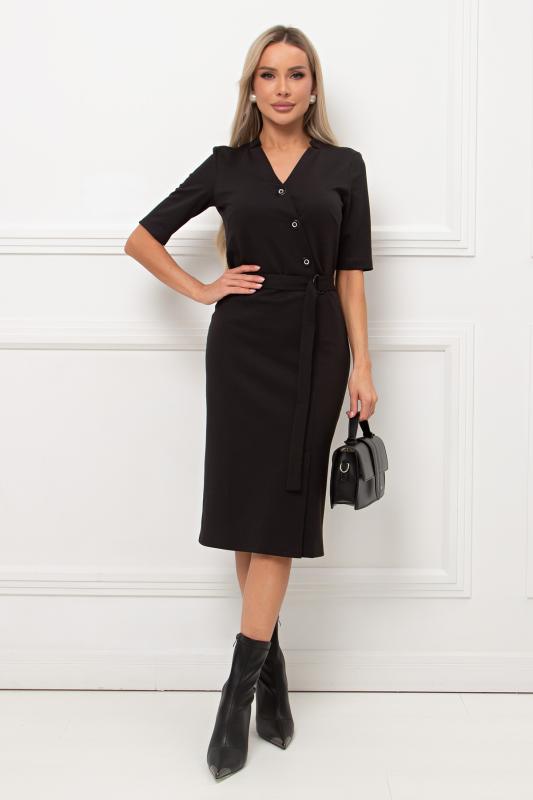Элегантное платье прилегающего силуэта из однотонного трикотажного полотна. Короткий втачной рукав. V - образная горловина переходящая в фиксированный запах на груди. По переду юбки выполнена шлица. Пояс из основного материала в комплекте.