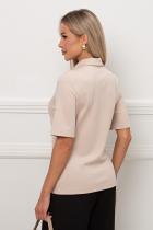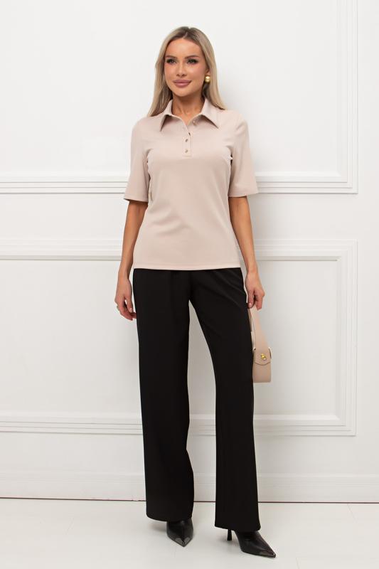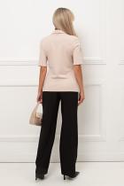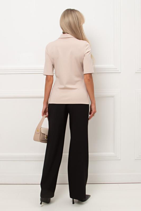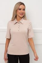 Комфортная блузка полуприлегающего силуэта из трикотажного полотна. Втачной рукав до локтя. Отложной воротник. Перед оформлен планкой с застежкой на петли и пуговицы. Низ ровный, без разрезов.