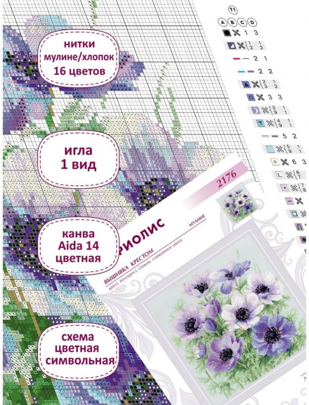 Мулине Anchor, 16 цветов, канва 14 Aida Zweigart серая, цветная схема. В наборе используются техники: крест, полукрест, стежок, смешанные цвета.